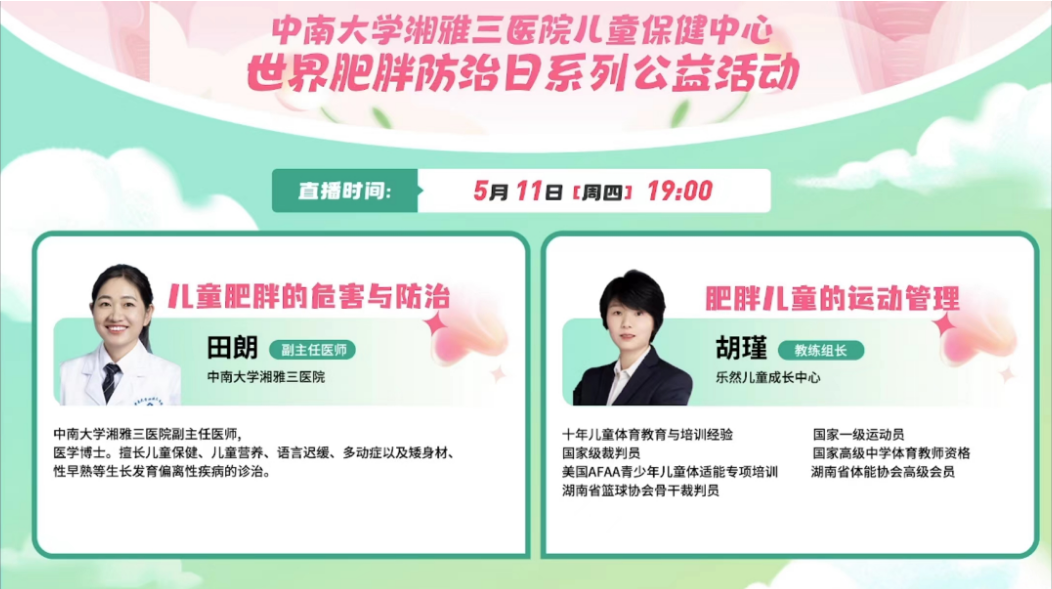 为推动党员干部进一步提高思想站位,切实以学促干,湘雅三医院儿童保健中心联合中国红十字基金会、成长天使基金开展了“5月11日世界防治肥胖日”健康讲座和专家义诊等公益活动。田朗副主任医师进行了《儿童肥胖的危害与防治》健康讲座、并邀请美国AFAA儿童体适能专项培训老师胡瑾科普肥胖儿童的运动管理,线上近1400余人参与。