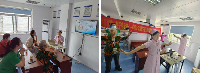 上午9点,大家兵分两路,一组人员在金萍教授的带领下在医院大厅现场坐诊。金萍教授仔细地询问每位患者的病史,耐心诊治。龙飞艳护士长带领护士为患者免费监测血糖、血压及健康咨询。 另一组人员在健康教育室开展糖尿病知识科普。国际伤口治疗师肖倩用PPT直观地为患者展示什么是糖尿病足及糖尿病足的危害,幽默风趣地讲解糖尿病患者如何保护足部,避免发生糖尿病足;课后,糖尿病专科护士贺娟、姚丽萍教病人跳八段锦。患者们纷纷表示,通过科普,大家对糖尿病有了新的认识,也更加有信心管理好糖尿病。