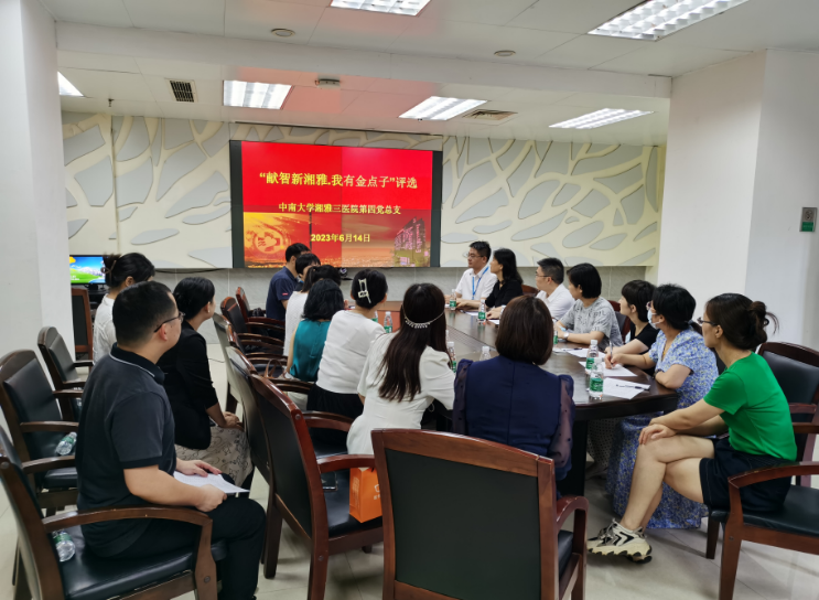 6月14日下午,中南大学湘雅三医院第四党总支在外科楼二楼远程会议室开展“献智新湘雅·我有金点子”评选活动。会议由第四党总支书记孙慧蓉主持,总支委员、支部书记、支委以及“金点子”作者30余人参加,医院党委委员、副院长朱利勇出席本次会议。