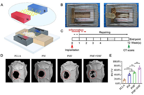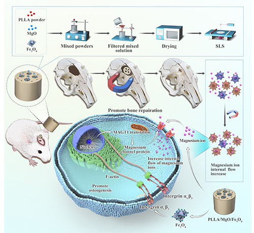全球每年因创伤、感染、肿瘤等导致的骨缺损患者约2,000万人,亟需进行骨缺损修复。目前已有采用生物材料来构建人工骨支架用于修复骨缺损的研究报道。但这些人工骨支架均需突破以下瓶颈问题:支架的成骨性能难以满足骨缺损修复的需求;支架形态难以与骨缺损形状完全契合;调控成骨的具体机制尚不明晰等。本研究受磁场能够调控细胞膜上离子通道蛋白的启发,将Fe3O4磁性纳米颗粒引入镁-聚合物基体中,并采用选择性激光烧结(SLS)法制备一种全新的磁性载镁人工骨支架,并在静磁场(SMF)驱动下递送镁离子进入细胞内用于加速骨修复。