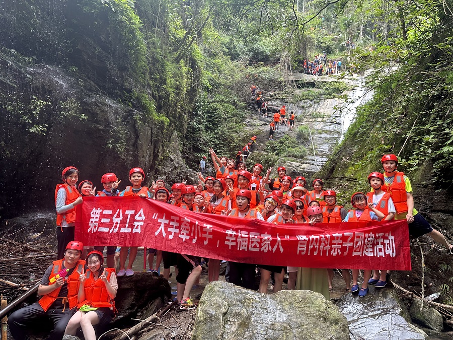 7月16日,中南大学湘雅三医院肾病风湿病科职工携家属共60余人,在易斌副主任、吴琼英护士长、蒋娟护士长带领下,乘大巴车前往浏阳金水河,进行“大手牵小手,幸福医家人”亲子团建溯溪活动。