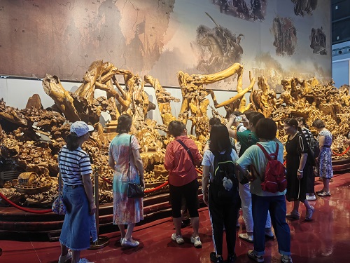 天意木国展览馆享有“寻根之旅”的美誉,所谓“天意”即天之意志,天趣之意,同时亦寓意为天一。它是以木文化为主题,意在弘扬中华民族传统文化,以奇根珍木为主体元素,匠心打造自然天成的根木项目。该馆由天意、天合、天道、天台、天趣、天成和红军长征根雕文化六大场馆组成。随着讲解员引领,老同志们走进了一个又一个由根雕构建的绮丽世界,老同志饶有兴趣的观看着每一件陈展物品:丝绸之路、清明上河图、上古神兽、人生百态、四大名著、孔子教学……老同志们纷纷感叹大师们雕刻艺术的鬼斧神工,民族传统文化的博大精深。四万多平米的奇根珍木展馆内,一件件造型奇特、天意昂然的作品,苍劲古朴、庄严厚重。虽经千万年沧桑巨变,却依旧焕发着新的艺术生命,见证着时代的变迁。