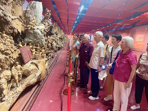 走到红军长征根雕文化馆,一件件巧夺天工、活灵活现、神奇如化的根雕作品将红军二万五千里长征的壮阔场景,栩栩如生地展现在面前,将老党员们的思绪带入那硝烟弥漫、战火纷飞的峥嵘岁月。大家纷纷感慨伟大的长征精神,体现了中华儿女吃苦耐劳、坚韧不拔的革命意志和团结战斗、无畏牺牲的英雄主义精神。老同志们沉浸式体验大中华优秀传统文化艺术,了解到藏品原木上万里的艰难运输过程,数月数年的精雕细琢,触摸着水流冲击、历史沉淀下的木纹,感慨万千,纷纷拍照留下美好回忆。