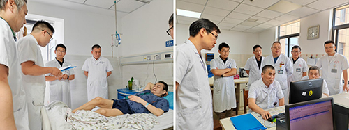 随后,交流团队在双峰县县人民医院普外科龚主任带领下参观了普外科病房,期间会诊了三个肝胆胰外科的疑难病例。在认真听取管床医生的病例汇报后,余枭教授、聂晚频教授、孙吉春副教授于床旁会诊,结合病史、体查及辅助资料等具体情况,就每位患者的后续诊疗计划提出了针对性的建议。护理团队也走进病房就院感、药品管理及外科加速康复病房的建设等方面内容进行了详细的交流和探讨。