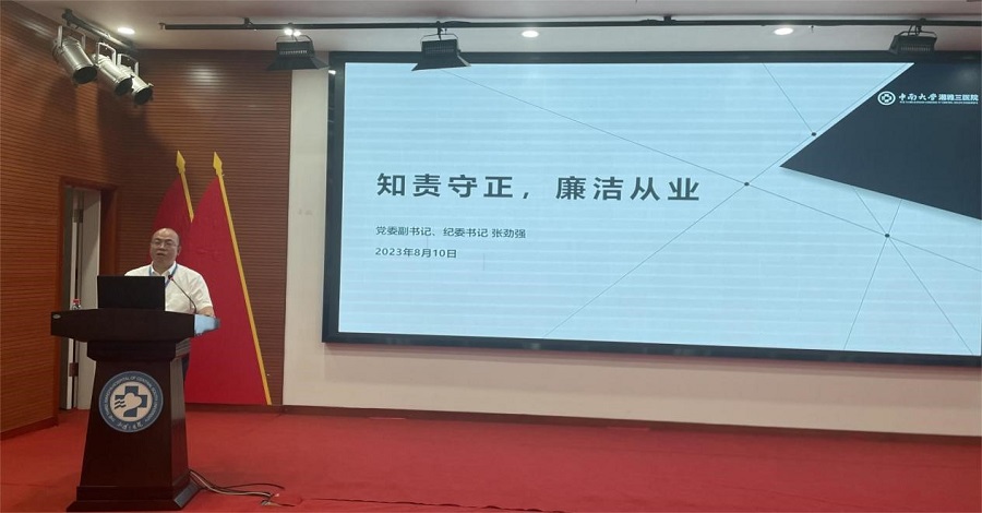8月10日,为深入贯彻党的二十大精神,进一步加强医院党风廉政和行风建设,增强医务人员廉洁自律意识,湘雅三医院药学部在外科楼二楼报告厅组织开展了行风廉政建设宣讲会。宣讲会由中南大学湘雅三医院党委副书记、纪委书记张劲强主讲,药学部副主任彭向东(主持工作)主持。纪委副书记、监察办主任万响,第六党总支书记余智萍,药学部教研室主任刘世坤,药学部副主任裴奇,教研室副主任郭韧等及药学部工作人员参加。