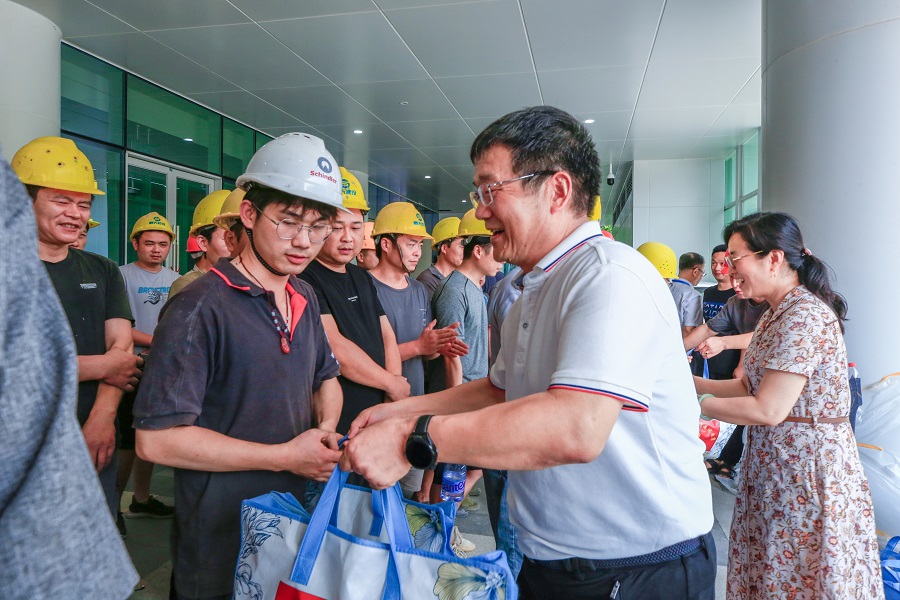 来到医院新门诊医技楼,江泓院长对大楼规划布局、建设和工程进展情况进行了详细的介绍,他表示随着这项健康工程的落地,将更好地造福三湘四水的人民群众。随后,刘湘凌主席一行代表省教育工会看望并慰问了奋战在高温一线的新门诊医技楼基建工地工友,感谢工友们顶烈日、冒酷暑、战高温服务于医院的建设,为健康湖南、健康长沙做出了贡献,并为每位工人送上了绿豆、清凉油、凉茶、运动水杯、运动巾等防暑降温“清凉大礼包”。他希望工友们在高质量、高速度完成建设任务的同时,也要注意劳逸结合,做好防暑降温,以饱满的精神、良好的状态助推项目如期完工。