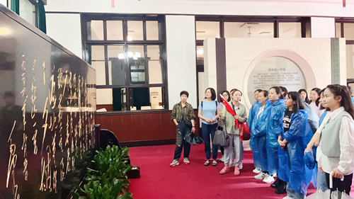 当日倾盆大雨,抵挡不住同志们对党史学习的热情。在前往韶山的大巴上,支部老党员们便向新入党的同志们讲述起了毛主席的事迹。韶山是毛主席出生和成长的地方,也是他点燃革命圣火,领导党和人民找到新民主主义革命正确道路,完成反帝反封建的任务,建立中华人民共和国,建立社会主义制度的起点。抵达韶山后,大家来到毛泽东铜像广场,在毛泽东同志铜像前列队整理着装,庄严肃立,向主席铜像敬献花篮,并在铜像前重温了入党誓词,重温革命历史、缅怀先烈功勋,通过庄重的仪式教育,让大家更加认识到作为一名共产党员所担负的使命和责任。