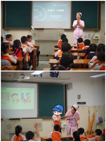 肖益芳主管护师以正确擤鼻涕方法开始互动,开启了以《小鼻子,大健康》为题的健康知识讲座。讲座借助视频、图片、教具等,用生动活泼的语言、惟妙惟肖的表情、引人入胜的表述带领孩子们学习了鼻子的结构、作用及鼻出血的预防。孩子们学习热情高涨,踊跃举手发言,并就自身存在的流鼻涕、鼻出血等问题提问。通过此次讲座,老师和家长纷纷表示正确擤鼻涕方法和指压止血法已深入孩子们的心里。