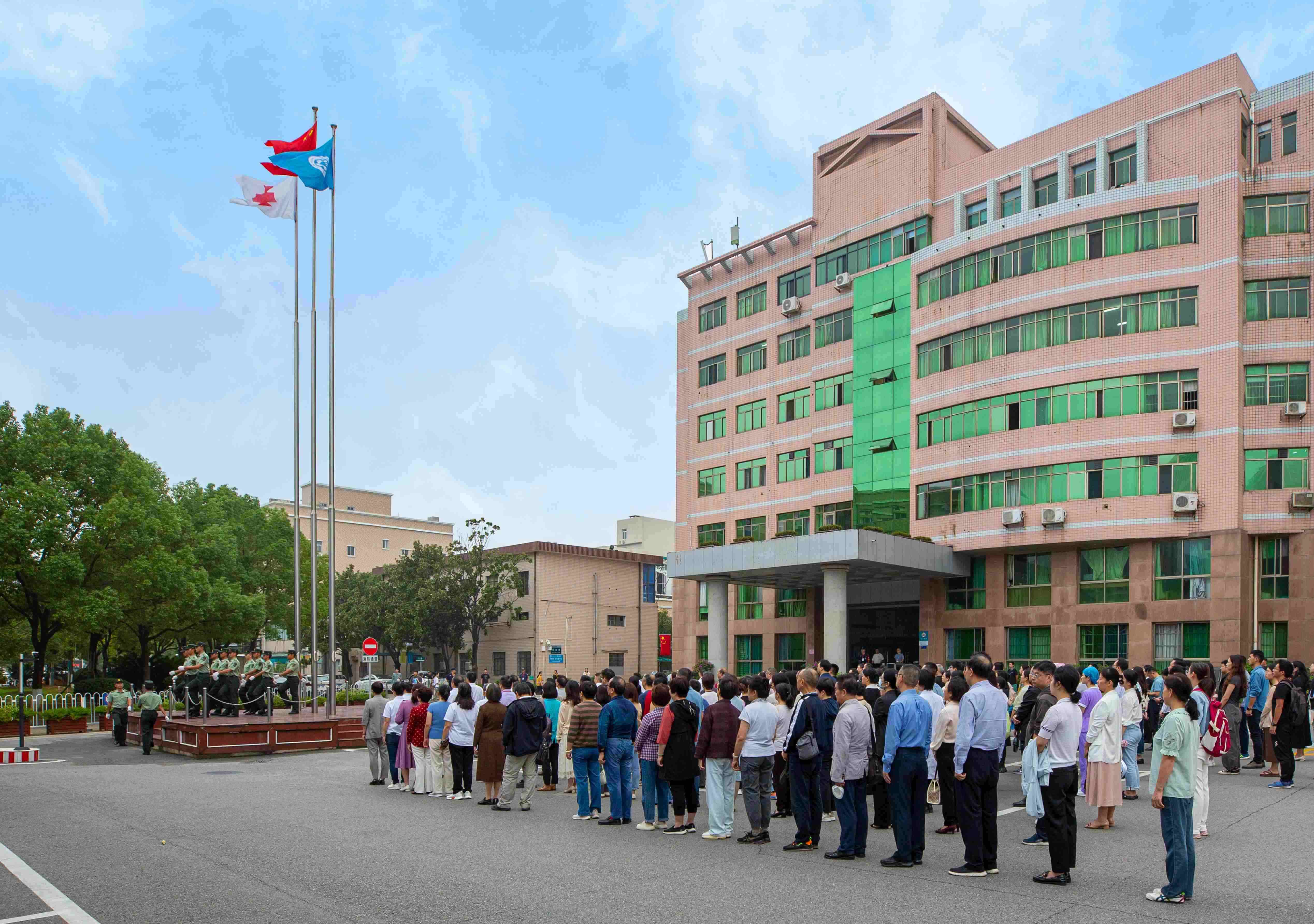 7点30分,仪仗队护送国旗走向升旗台,在庄严的国歌声中,五星红旗冉冉升起。全体人员列队在综合楼前,注目肃立,齐唱国歌,向祖国母亲致以崇高敬意和真切祝福。