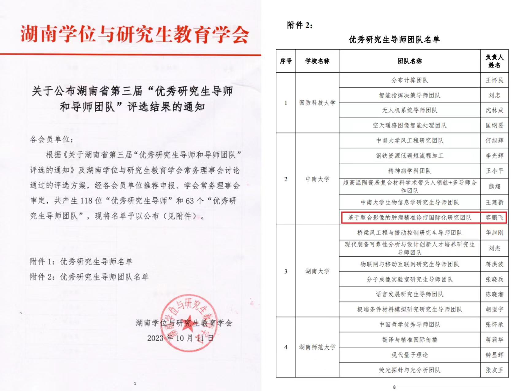 10月11日,从湖南学位与研究生教育学会传来喜讯,中南大学湘雅三医院放射科容鹏飞教授作为“基于整合影像的肿瘤精准诊疗国际化研究团队”项目的负责人,获评“湖南省第三届优秀研究生导师团队”,容鹏飞教授获得“湖南省第三届优秀研究生导师团队负责人”荣誉称号。