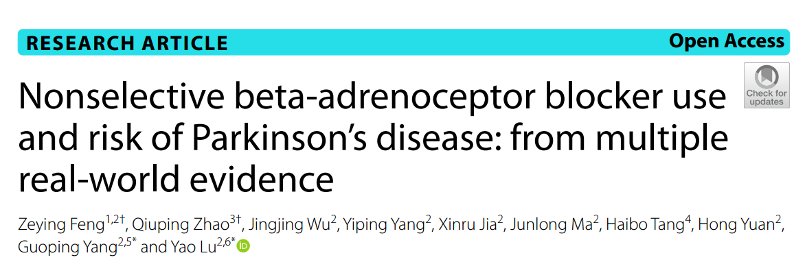 11月14日,中南大学湘雅三医院阳国平教授团队联合陆瑶教授团队在国际权威期刊BMC Medicine(5yIF:10.4,中国科学院一区),在线发表高水平论文“非选择性β-肾上腺素受体阻滞剂的使用与帕金森病的风险:基于多个真实世界证据(Nonselective beta-adrenoceptor blocker use and risk of Parkinson’s disease: from multiple real-world evidence)”。陆瑶教授和阳国平教授为该研究的共同通讯作者,冯泽英博士、赵秋平博士为论文共同第一作者。