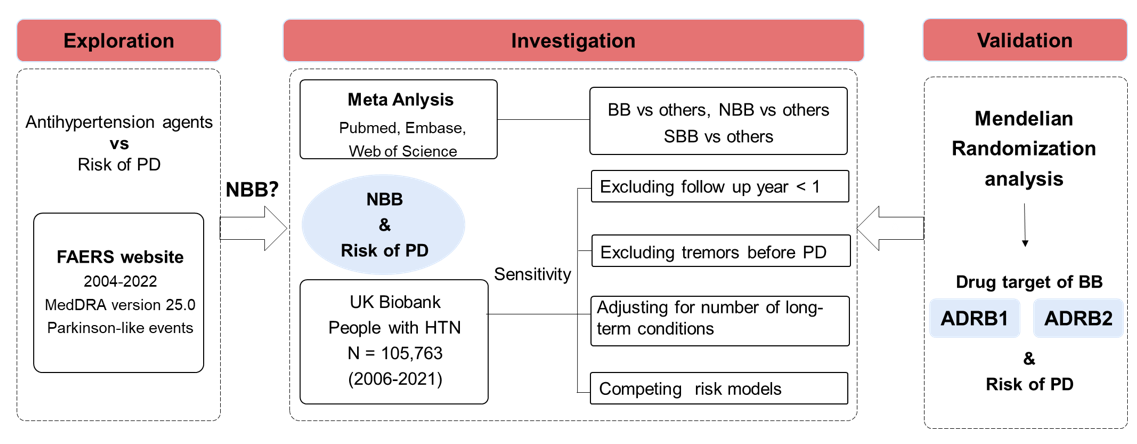 高血压患者远期发生帕金森病的风险较高,流行病学证据表明,除血压水平本身,不同抗高血压药物可能影响帕金森病的发生和发展,但既往研究结果并不一致,缺乏真实世界的高质量探索研究。本研究首先基于FDA药物警戒数据库的分析发现非选择性β-肾上腺素受体阻滞剂与帕金森病发病相关;随后,通过对已发表研究的荟萃分析和大规模人群的队列分析验证了这一现象;进一步借助基因组学数据,探索并验证了这类降压药与帕金森病风险的机制。这一研究率先基于多维度真实世界数据,并联合多组学,为高血压人群用药远期风险提供了高质量证据。