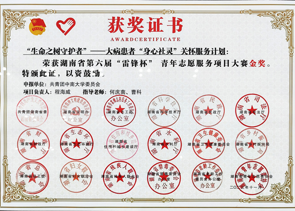 11月29日下午,湖南省“百万青少年学雷锋”志愿服务交流会暨第六届“雷锋杯”青年志愿服务项目大赛颁奖仪式举行,中南大学湘雅三医院“‘生命之树守护者’——大病患者‘身心社灵’关怀服务计划”项目荣获本次大赛金奖。团省委书记李志超在仪式上发表讲话,省委宣传部、省科技厅、省司法厅、省卫健委、省水利厅、省总工会、团省委、省妇联、省残联、省乡村振兴局、省禁毒办等厅局领导出席相关活动。