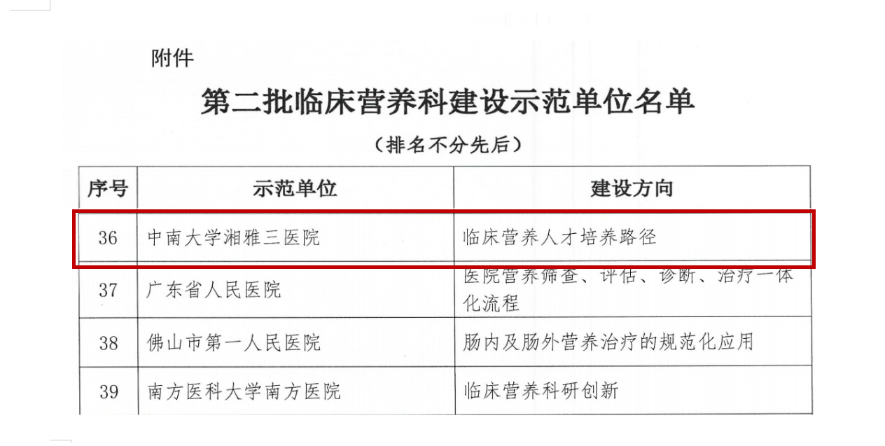 12月20日,国家卫生健康委医院管理研究所公布“第二批临床营养科建设示范单位”,中南大学湘雅三医院获“临床营养科建设示范单位——创新营养人才培养路径方向”,这也是湖南省内唯一获得“创新营养人才培养路径”方向的单位。