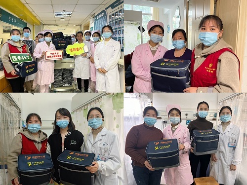 红黄相间的气球,引人瞩目的节日装饰和暖心的节日祝福,营造出浓厚的节日氛围。上午十时,驻点医务社工与科室医护人员带着精心准备好的爱心保温包进入病房,逐一赠送给白血病患儿家庭,这份突如其来的惊喜让原本沉寂的病房变成了温暖的港湾。“送你们家一个保温包,希望你们能在寒冷的冬日里吃到热腾腾的饭菜,祝你们早日康复出院!”一句简单的祝福,让患儿及家属们倍感温暖,整个病房里其乐融融,患儿家属们纷纷称赞医院的温馨之举。深切的话语、暖暖的爱意,传递着病房的温情。