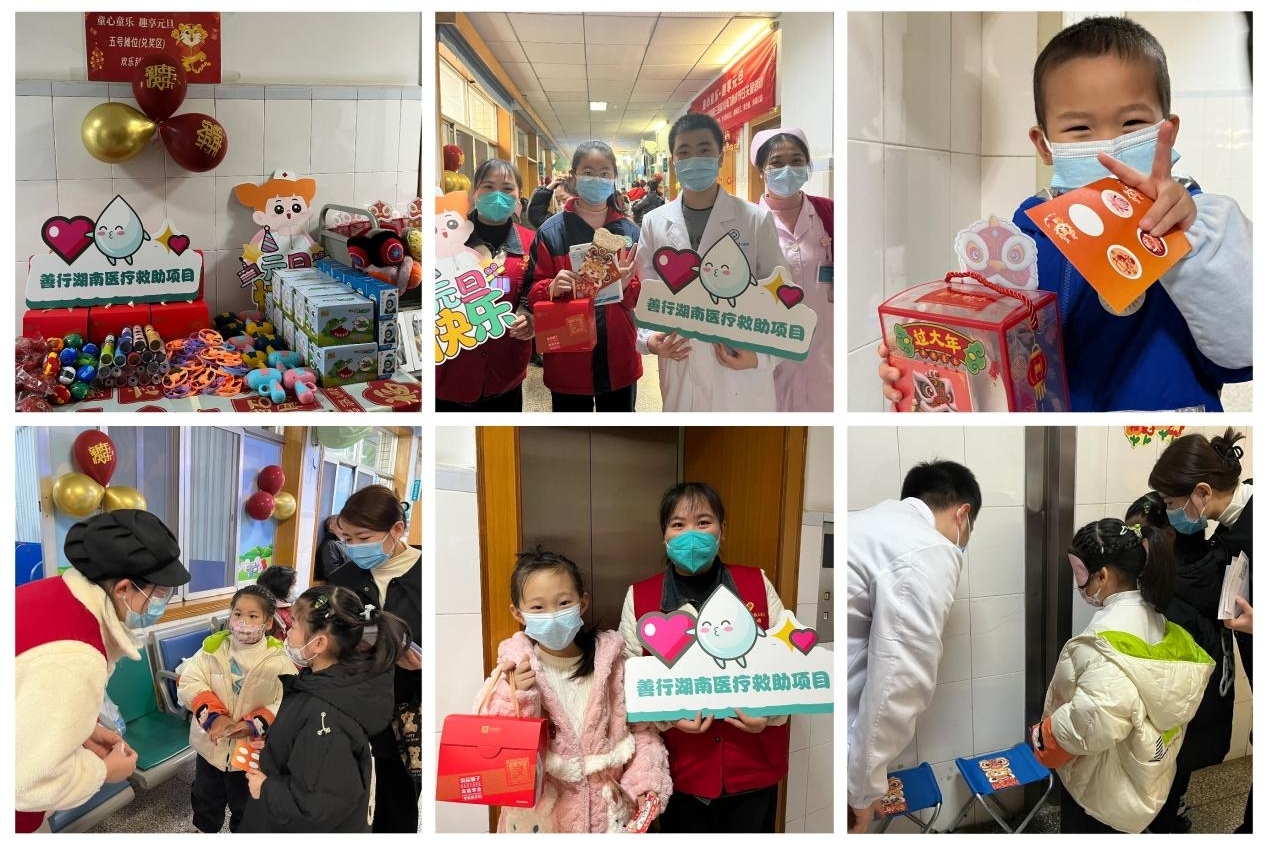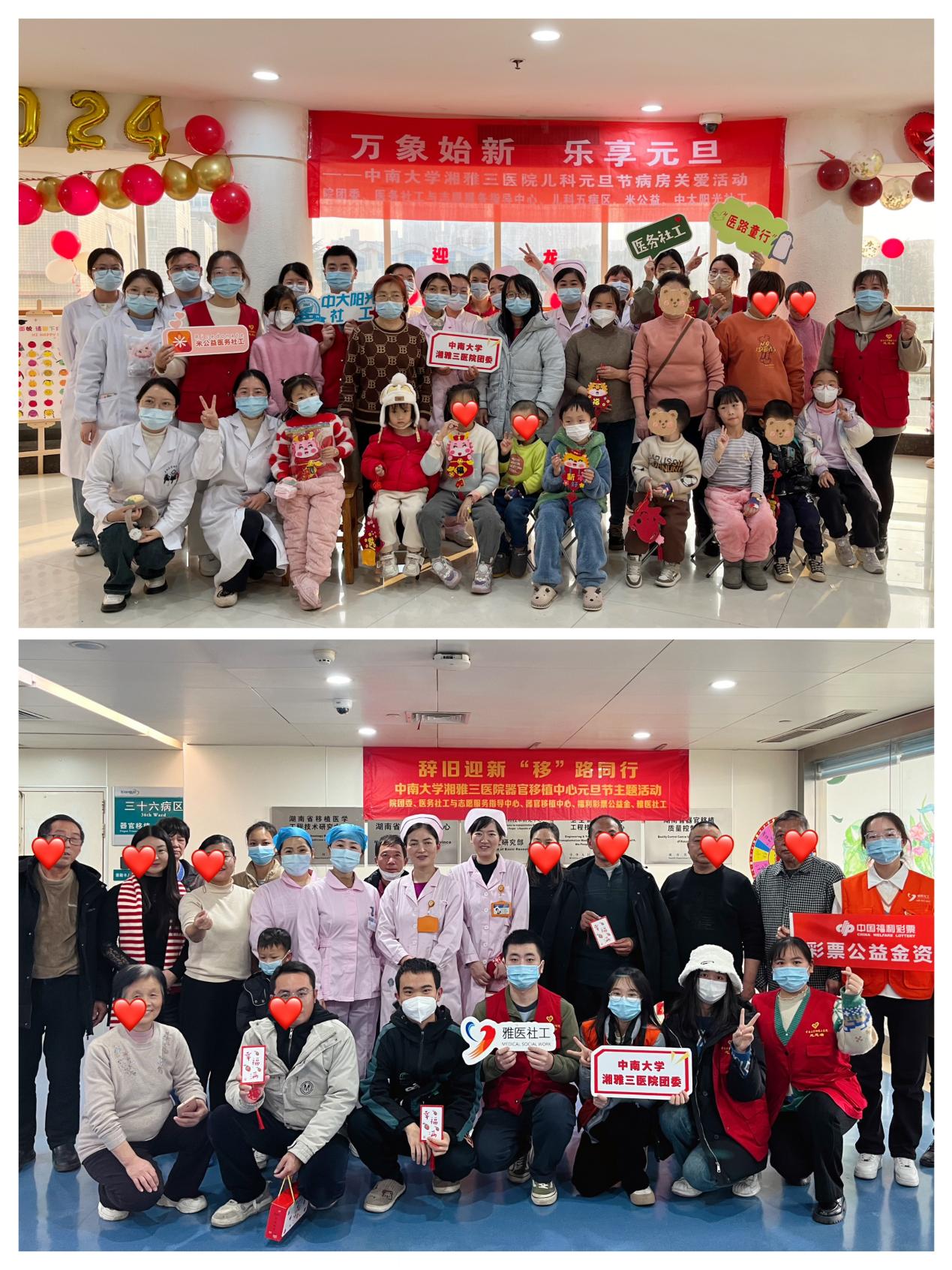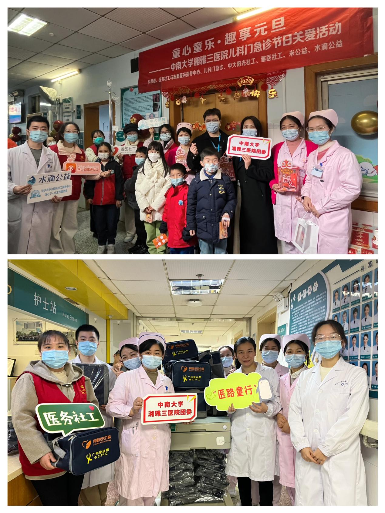一元复始,万象更新。在辞旧迎新之际,中南大学湘雅三医院团委、医务社工与志愿服务指导中心联合湖南省雅医医务社会工作服务中心、长沙市中大阳光社会工作服务中心,在水滴公益、米公益、中国福利彩票公益金等公益组织的支持下,于12月27日—29日先后在儿科五病区、器官移植中心以及儿科门急诊举办了元旦节关爱病友系列活动。院团委书记、医务社工与志愿服务指导中心主任程海威,儿科五病区护士长蔡骞,儿科门急诊护士长刘海燕,器官移植中心三十五病区护士长刘立芳,团委委员戴萍萍、驻点医务社工、部分医护人员、患者和陪护家属近五百人参加活动。