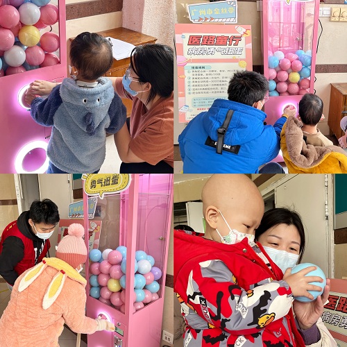 由于血液肿瘤患儿需长时间与病魔作斗争,抗击化疗的过程非常艰难,加之频繁地抽血化验、定期进行腰穿和骨穿检查,这都让这群小患儿们承受着巨大的压力与痛苦。为降低患儿对医疗操作的恐惧感,提升患儿就医依从性,缓解患儿住院压力,驻点医务社工与医护人员积极链接社会公益资源,引进了“勇气扭蛋”医疗游戏辅导公益项目并在儿科五病区正式启动。