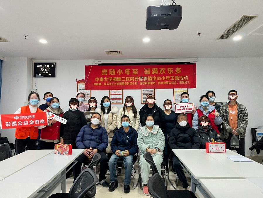 癸卯岁末,甲辰伊始,小年将至,年味愈浓。为弘扬中华优秀传统文化,让住院患者及家属感受节日氛围,中南大学湘雅三医院团委、医务社工与志愿服务指导中心联合湖南省雅医医务社会工作服务中心、长沙市中大阳光社工服务中心,在水滴公益、雅医基金会、中国福利彩票公益金等公益组织支持下,于1月30日、2月1日先后在器官移植中心、血液内科开展了小年关爱病友系列活动。团委书记程海威,团委副书记戴萍萍,血液内科主任李昕,14病区护士长阮春红,41病区护士长李成媛,驻点医务社工、部分医护人员、患者及陪护家属近百人参加活动。