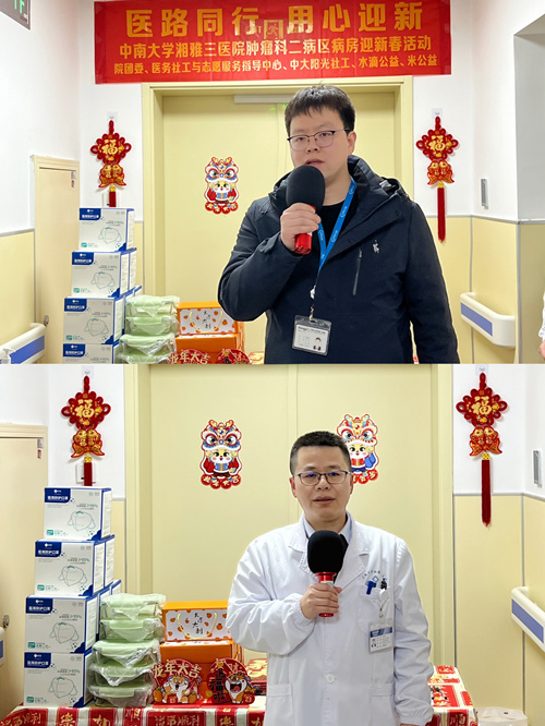 2月5日下午,团委联合长沙市中大阳光社工服务中心、水滴公益在肿瘤科二病区举办了“医路同行 用心迎新”病房迎新春活动。活动前夕,驻点医务社工和志愿者们布置了病房,挂起红灯笼,贴上春联和窗花,给病房增添了浓浓的节日氛围。活动当天,团委书记程海威,肿瘤科副主任(主持工作)兼放疗中心主任刘学文,肿瘤科二病区护士长郭娜出席活动,向住院病友致以了节日问候与新春祝福,表达了社会的关爱、公益组织的关怀、医院的关心。活动现场设置了“年味——新年照相馆、年趣——连年有余、年乐——新年套圈圈、年礼——福运抽奖处”等多个趣味互动项目,吸引众多住院病友和医护人员积极参与,现场欢声笑语不断,一派欢乐祥和。