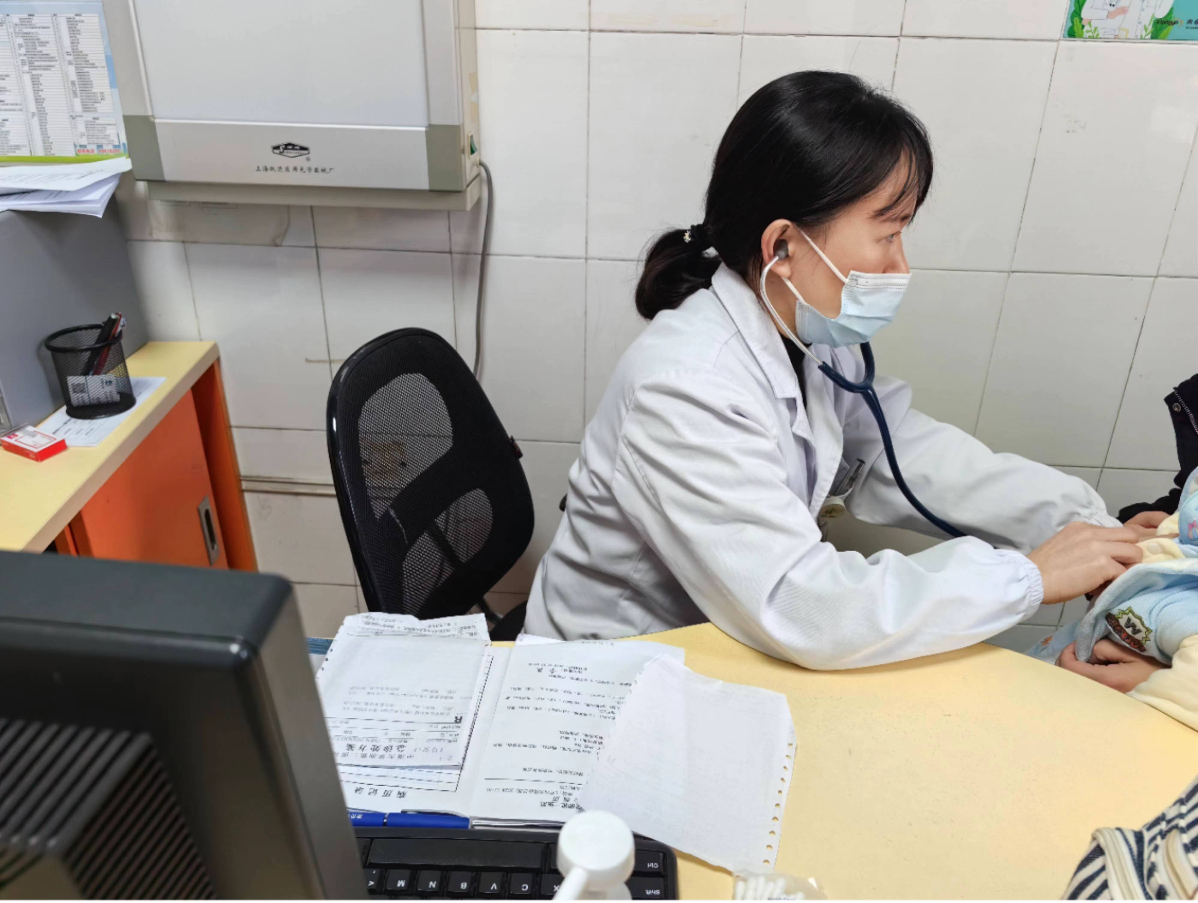 墙上的钟表在滴答滴答地走着,讲述着除夕这个特别的日子。此刻,一位年轻的医生正在给小朋友检查身体情况,新年的曙光照亮了医院也照亮了医生与病人的心,同时她的认真也让患儿和家属在这个冬日感受到了温暖与希望。