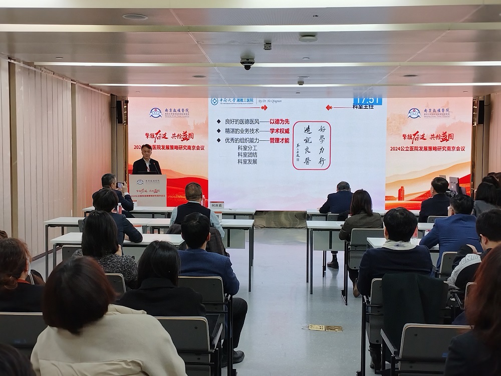 何庆南同志在2024公立医院发展策略研究南京会议上,以《党建引领文化建设推进医院高质量发展》为题进行专题讲座。他从新湘雅发展概况、管理工作创新与文化建设以及医院高质量发展实践思考三个方面,强调构建新时代新湘雅新文化。