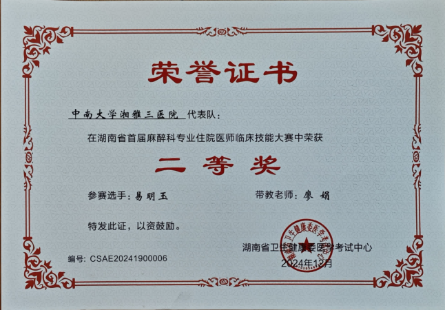 12月13日,由湖南省卫生健康委医学考试中心主办的“湖南省首届麻醉科住培医师临床技能大赛”在长沙圆满落幕。经过紧张而激烈的角逐,湘雅三医院麻醉科廖娟指导医师与易明玉住院医师凭借出色的专业技能和团队协作,荣获大赛二等奖。