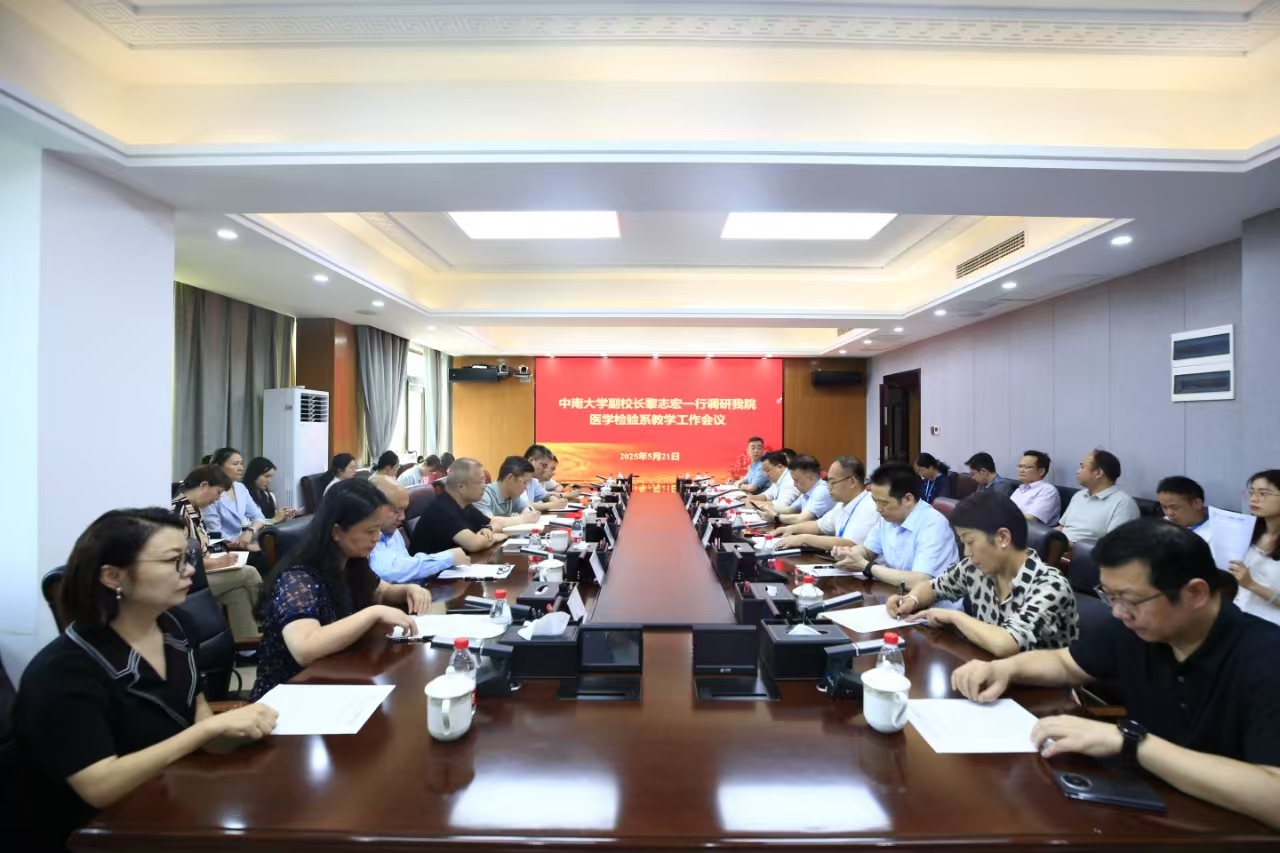 2025年5月21日下午,中南大学党委常委、副校长黎志宏一行来到中南大学第三临床学院,就医学检验系教学工作展开深入调研。湘雅医学院党委书记朱利勇、党委副书记吴世明,副院长刘洪、李学军、曾艺,湘雅三医院党委书记何庆南、院长江泓,湘雅医院、湘雅二医院、湘雅三医院检验科、输血科负责人,医学检验系全体教师,第三临床学院本科教学指导委员会(检验)成员、教务部、学科办、毕教办、研究生部负责人,检验系学生代表参加会议。会议由湘雅三医院副院长曹科主持。