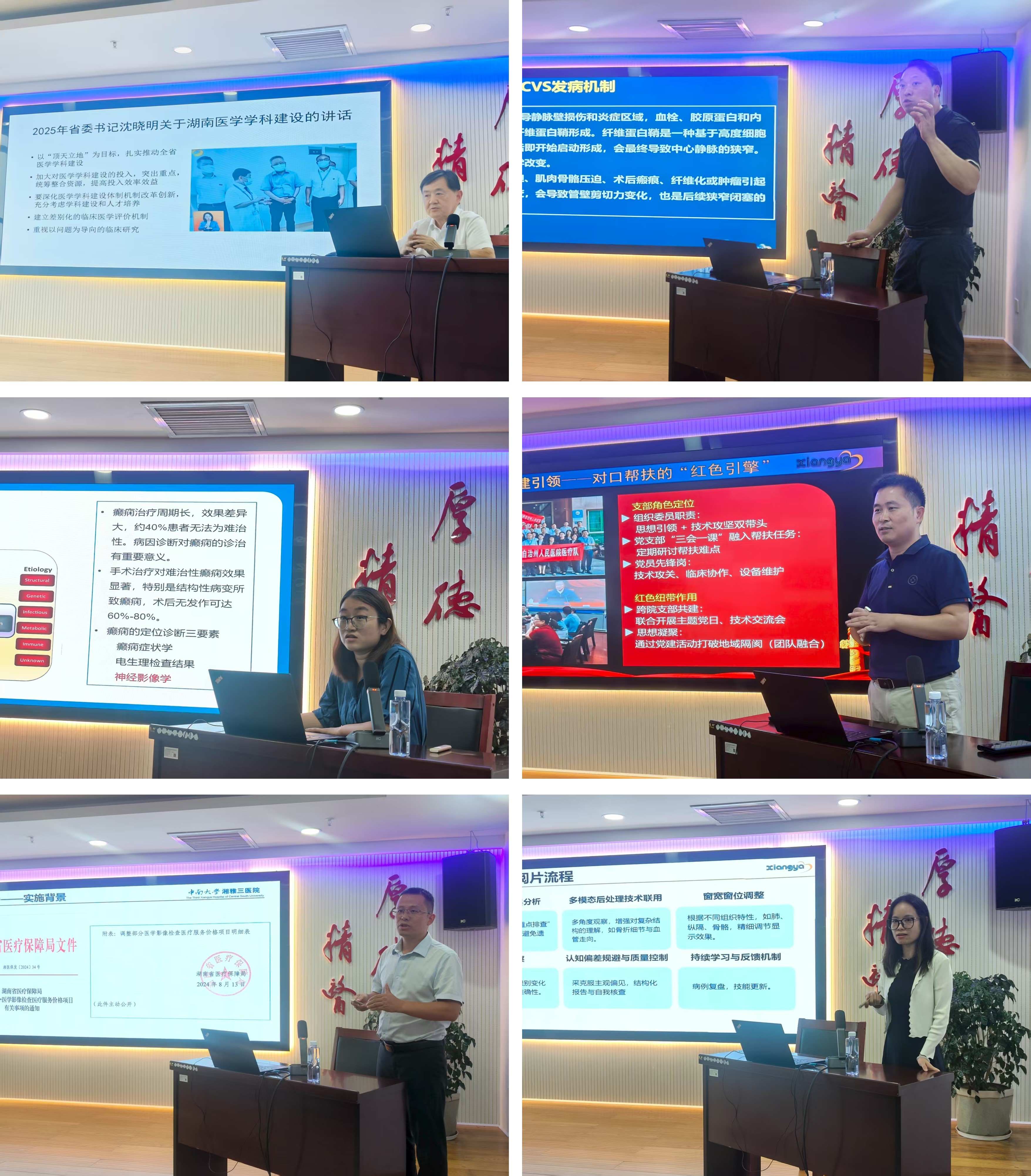 随后,湘雅三医院首席专家王维首先作《党建引领下的学科建设》专题报告,报告中,他聚焦新时代党建与学科融合发展的要求与挑战,结合湘雅院训强调了党员的使命与担当。放射科副主任(主持工作)梁琪系统解读《基于UKKA指南的中心静脉狭窄诊疗规范》,从指南到实践全面介绍诊疗标准,突出党员在技术推广与基层医疗质量提升中的带头作用。副主任柳茵深入解析《癫痫的磁共振诊断要点》,分享前沿影像技术与诊断思路,鼓励党员带头学习新技术,更好地服务患者。CT技师长彭松对《湖南影像检查结果互认形式与对策》进行政策解读,提出应对新政策的具体措施,强调党员在政策执行中的责任担当。业务骨干杨晓通过《急诊影像的“隐形”杀手》报告,结合案例指出急诊影像中关键诊断环节,倡导党员在提升诊断精准度中发挥模范作用。此外,派驻湘西的帮扶专家、支部组织委员廖云杰作《党建引领下的对口帮扶——实践与思考》报告,总结帮扶工作举措、成效与挑战,体现党建引领在凝聚共识、破解难题中的核心作用。最后,湘西自治州人民医院影像科主任龚光文对湘雅三医院此次活动再次表示衷心感谢,他提出以“党建引领、高度融合、注重实效”为核心,强调未来帮扶应继续突出党建引领作用,明确了后续合作中的重点方向,激励双方党员进一步增强责任担当,共同助力基层医疗服务能力提升。