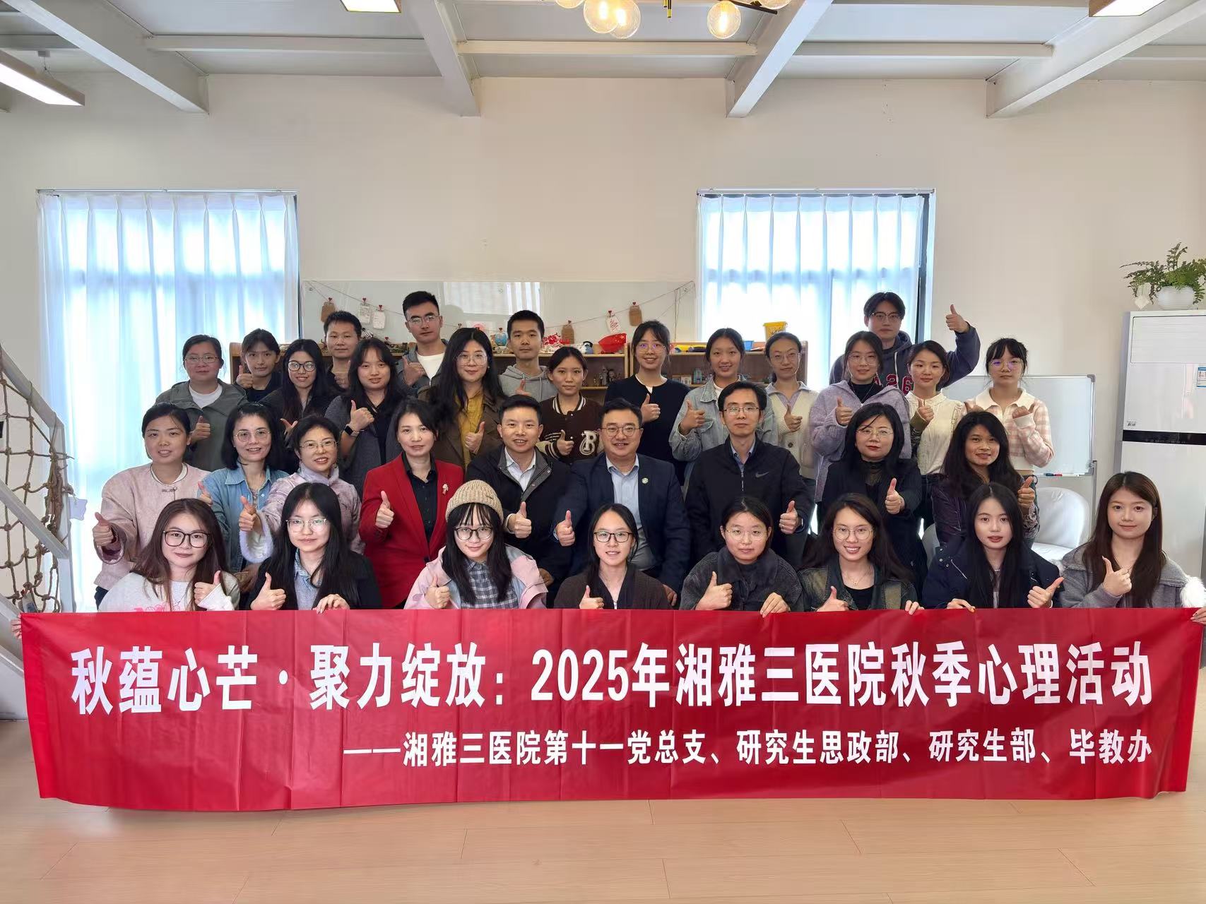 秋意渐浓,心暖如煦。为扎实推进医学生心理健康教育工作,10月31日,中南大学湘雅三医院在后湖国际艺术区“知愈集”举办“秋蕴心芒·聚力绽放”2025年秋季心理主题活动,同步开展医学生朋辈心理互助队换届暨骨干培训。院党委委员、副院长曹科,研究生思政部与研究生部负责人、教师代表、互助队全体成员、学生党支部书记与班长代表共同参与,在温馨融洽的氛围中共赴一场心灵成长之约。