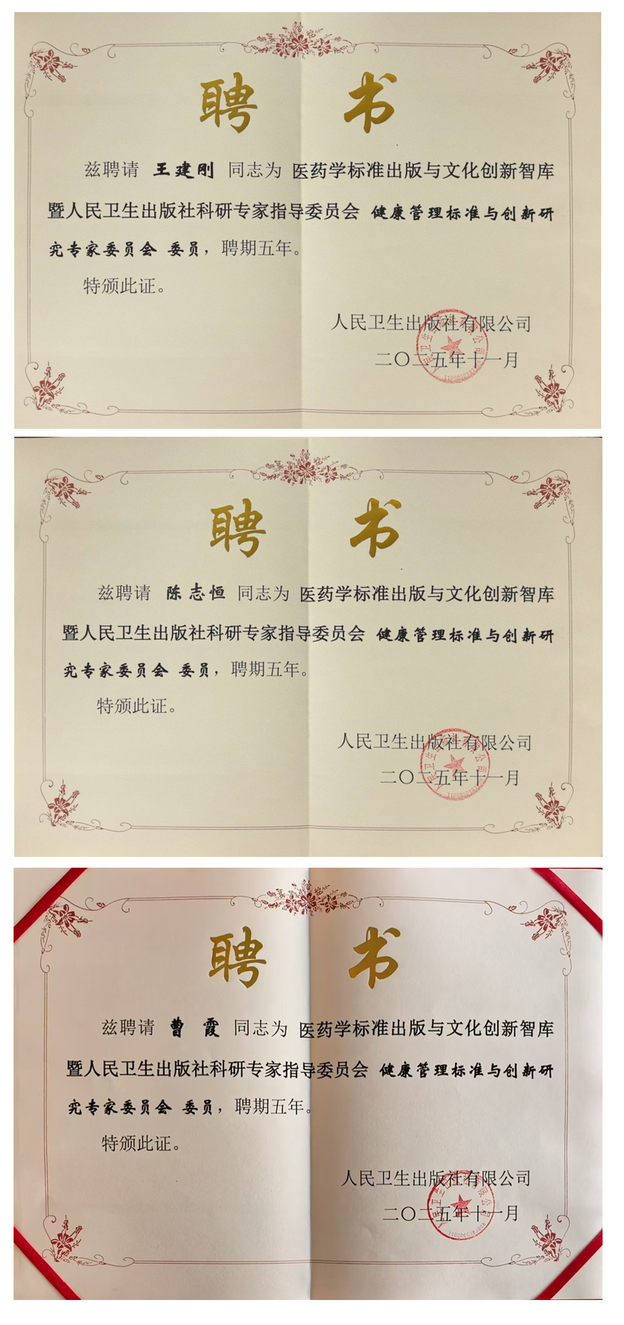 医药学标准出版与文化创新智库由人民卫生出版社于2023年联合百位出版界专家及医学标准建设领域专家组建,旨在以创新赋能发展,以标准引领行业进步,为文化强国与健康中国建设贡献智慧。此次获聘,既彰显了行业对中心专家团队深厚学术积淀与卓越创新能力的高度认可,也为专家们发挥专业所长搭建了更广阔平台。四位专家将以此为新起点,依托这一高端学术阵地,更深度参与健康管理行业标准制定与创新研究,为我国健康管理事业高质量可持续发展注入强劲智慧动能。