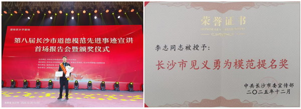 2025年12月30日下午,第八届长沙市道德模范先进事迹宣讲首场报告会暨颁奖仪式在岳麓山实验室举行。现场表彰了18位道德模范奖获得者和12位道德模范提名奖获得者,充分发挥示范引领作用,为推动高质量发展、建设现代化长沙和全国精神文明提供了有力的道德滋养与精神支撑。湘雅三医院肾内科李志医生受邀参加,获评“见义勇为”类提名奖。他在群众危难时刻挺身而出,在组织需要时积极向前,以专业与担当的实际行动诠释“医者仁心”,展现了新时代医务工作者的职业价值。