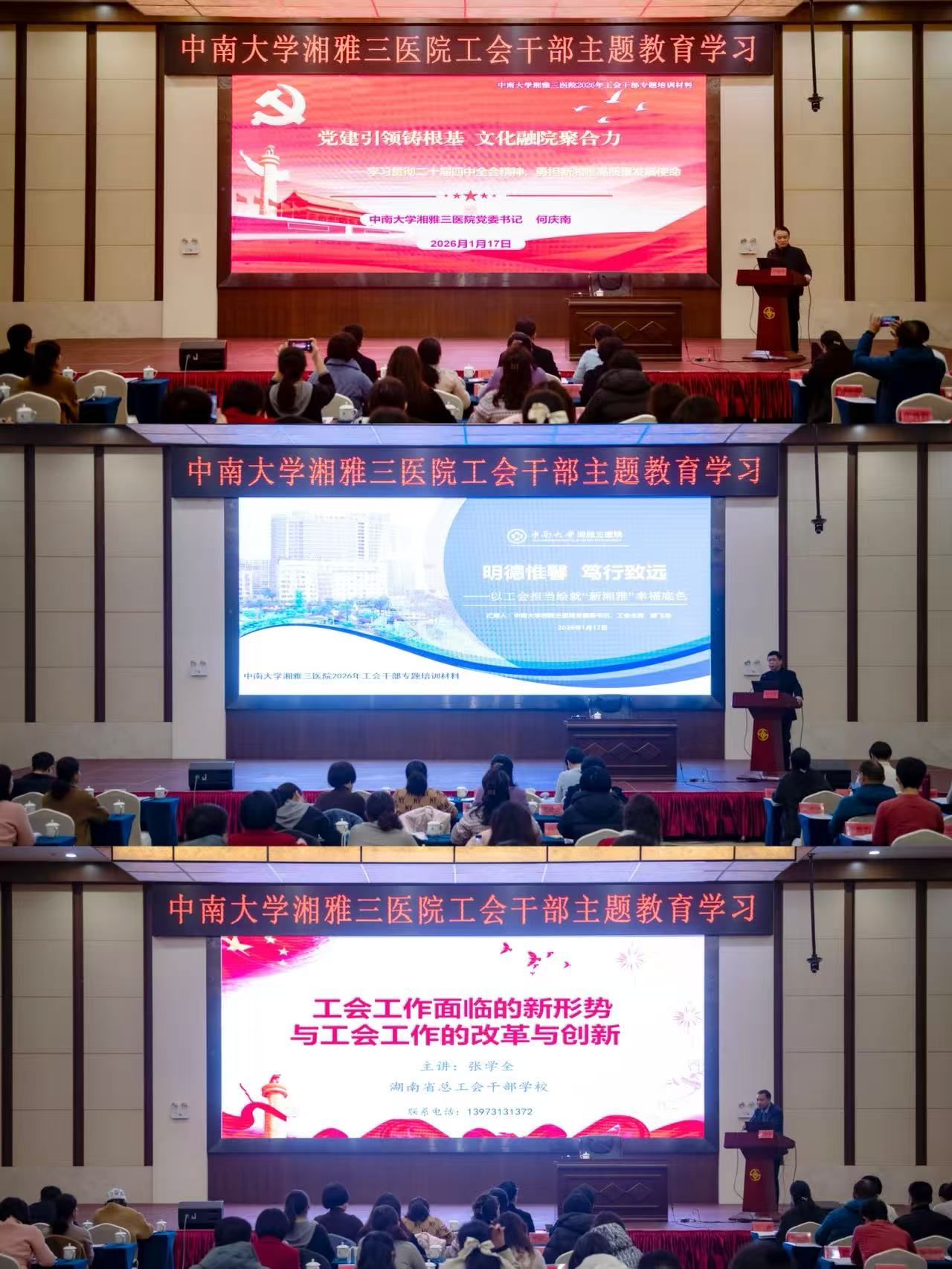 冬日岁寒,初心炙热。在全党全国深入学习贯彻党的二十届四中全会精神、奋力开启“十五五”发展新征程之际,1月16日至18日,中南大学湘雅三医院“凝心铸魂强本领 传承工运践初心”2026年工会干部主题教育学习在湖南省总工会干部培训中心(湖南职工疗养院)圆满举办。医院党委书记何庆南,党委副书记、工会主席杨飞龙,湖南省总工会干部学校原校长张学全等领导专家出席并授课,医院党委办公室、党委宣传部、团委、离退休工作办公室、党委教师工作部、研究生思政部等党群部门负责人受邀参加,与来自全院各科室、各分工会的80余名工会干部齐聚一堂,集中学习、交流共进。