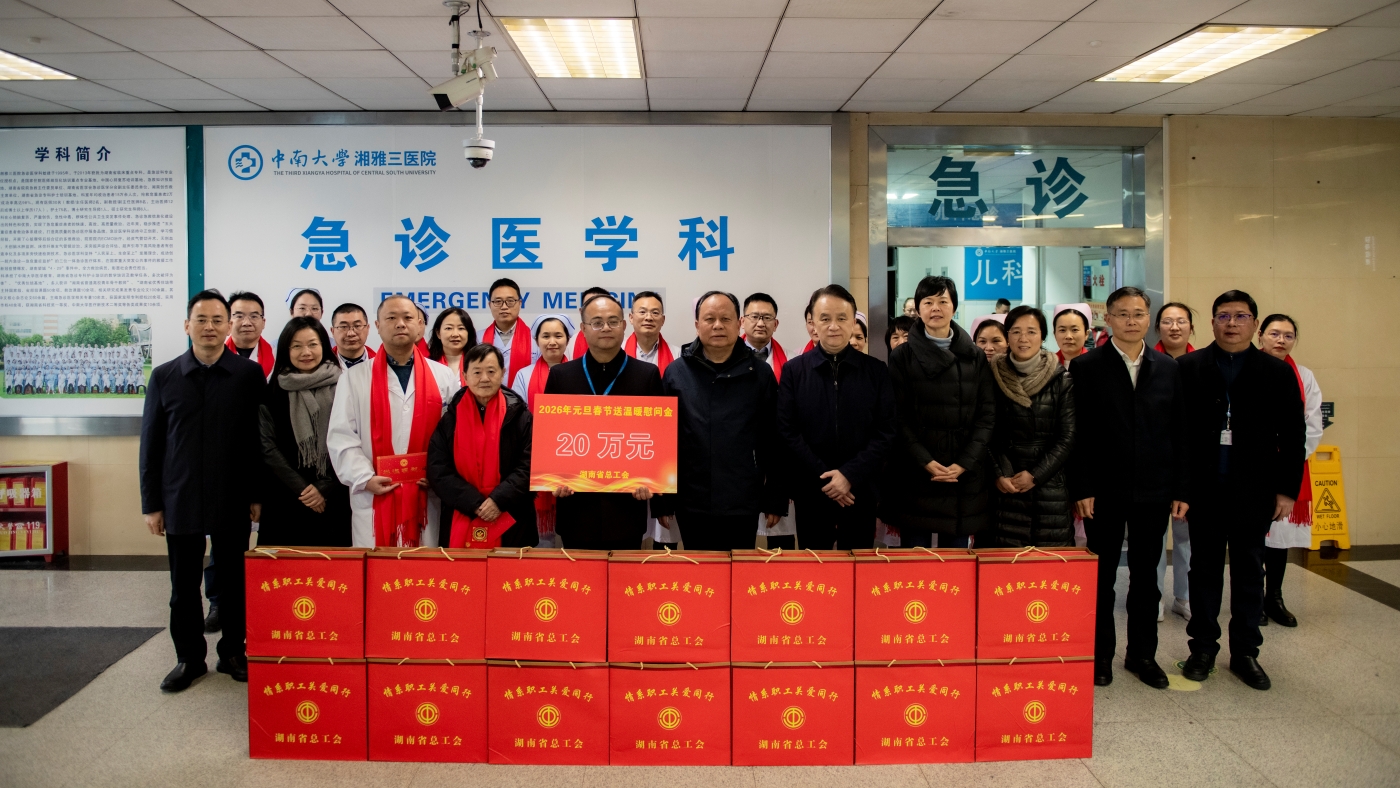 现场,周农主席代表省总工会向湘雅三医院送上20万元慰问金,医院党委副书记、院长江泓接牌,全场响起热烈掌声。同时,慰问团一行还为20名临床一线职工代表发放了慰问物资,向坚守急诊救治一线、守护群众健康的医务工作者致以崇高敬意。