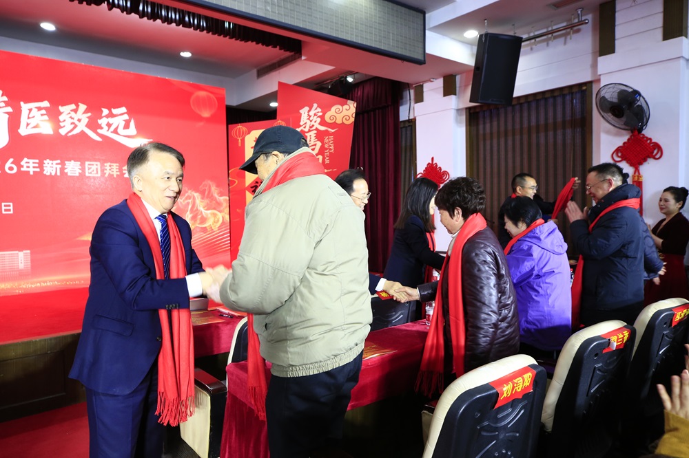 演出结束后,全体院领导为离退休老同志代表戴上喜庆红围巾,感恩前辈的付出,随后集体登台,向全院职工拜年,送上诚挚的新春祝福。最后,与会领导与全体中层干部一同合影留念,定格下这充满欢乐与希望的难忘时刻。