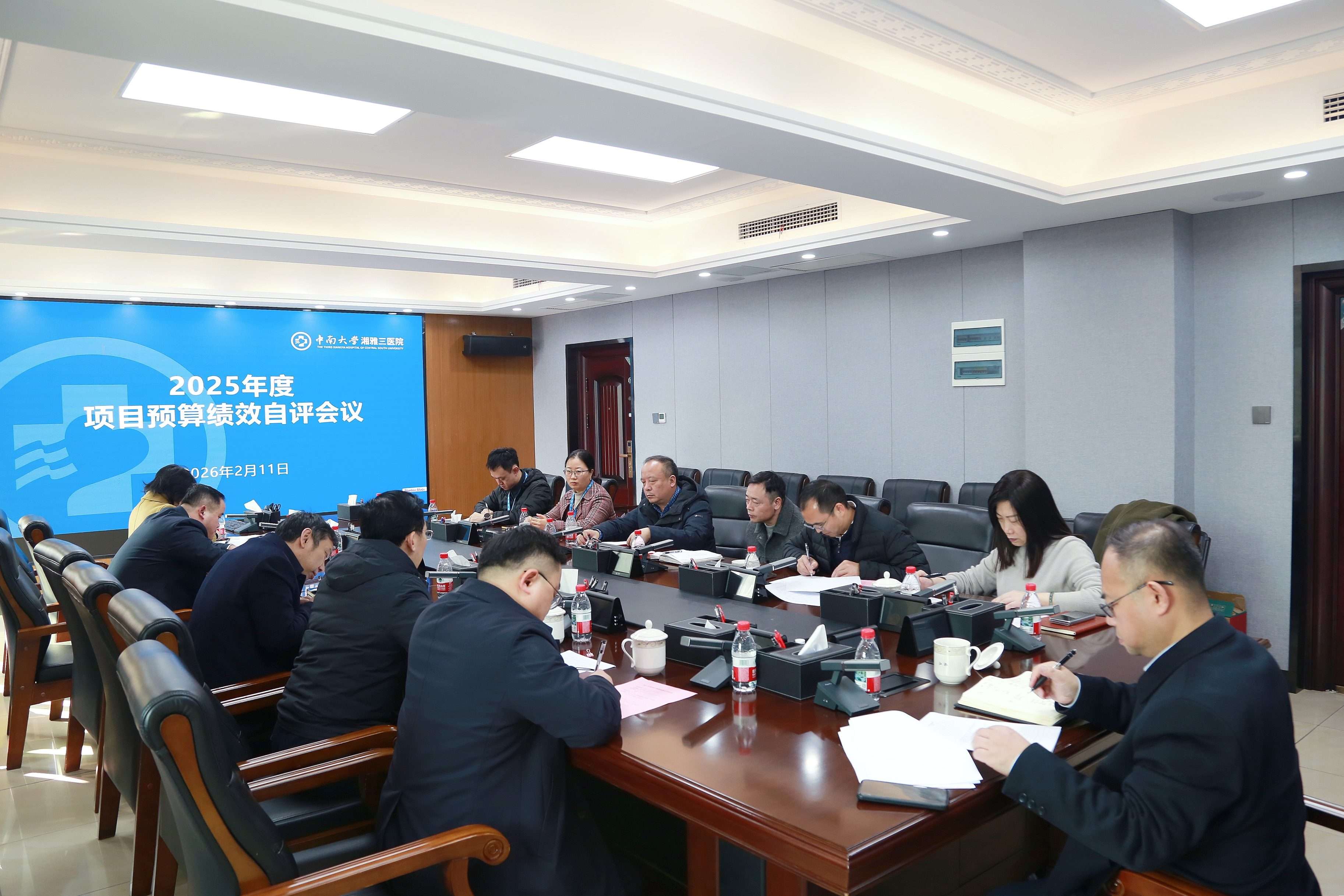 2026年2月11日下午,中南大学湘雅三医院召开2025年度项目预算绩效自评会议。院长江泓,总会计师费云,副院长左笑丛、曹科、孙传政、容鹏飞出席会议,医学装备部、后勤保障部、基建办、科研部、毕业后医学教育办、财务部等项目牵头部门负责人参加,会议由费云主持。