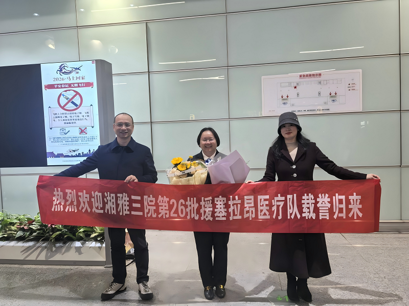 3月11日,中南大学湘雅三医院妇产科潘琼副主任医师,作为中国(湖南)第26批援塞拉利昂医疗队成员兼药械组组长,圆满完成为期一年的援非医疗任务,随医疗队一同归国。医院领导及潘琼家属怀着无比喜悦与崇敬的心情,前往长沙黄花国际机场迎接,用鲜花与掌声,致敬这位跨越山海、践行使命的湘雅白衣使者。