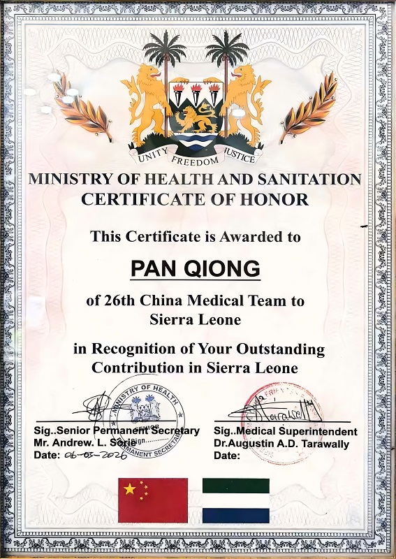 援非期间,她还珍惜宝贵的交流学习机会,与队友曾磊、刘波一同登上停靠在塞拉利昂港口的“全球仁慈号”医疗船参观交流,围绕妇女健康诊疗服务流程与措施,与国际医护人员深入探讨,积极分享我国妇产科诊疗经验,同时学习借鉴国际先进医疗理念与技术,拓宽专业视野、提升服务能力。凭借一年来的突出贡献,她与其他队员一同荣获塞拉利昂卫生部授予的“杰出贡献奖”,用实干与奉献赢得了受援国政府与人民的高度认可。