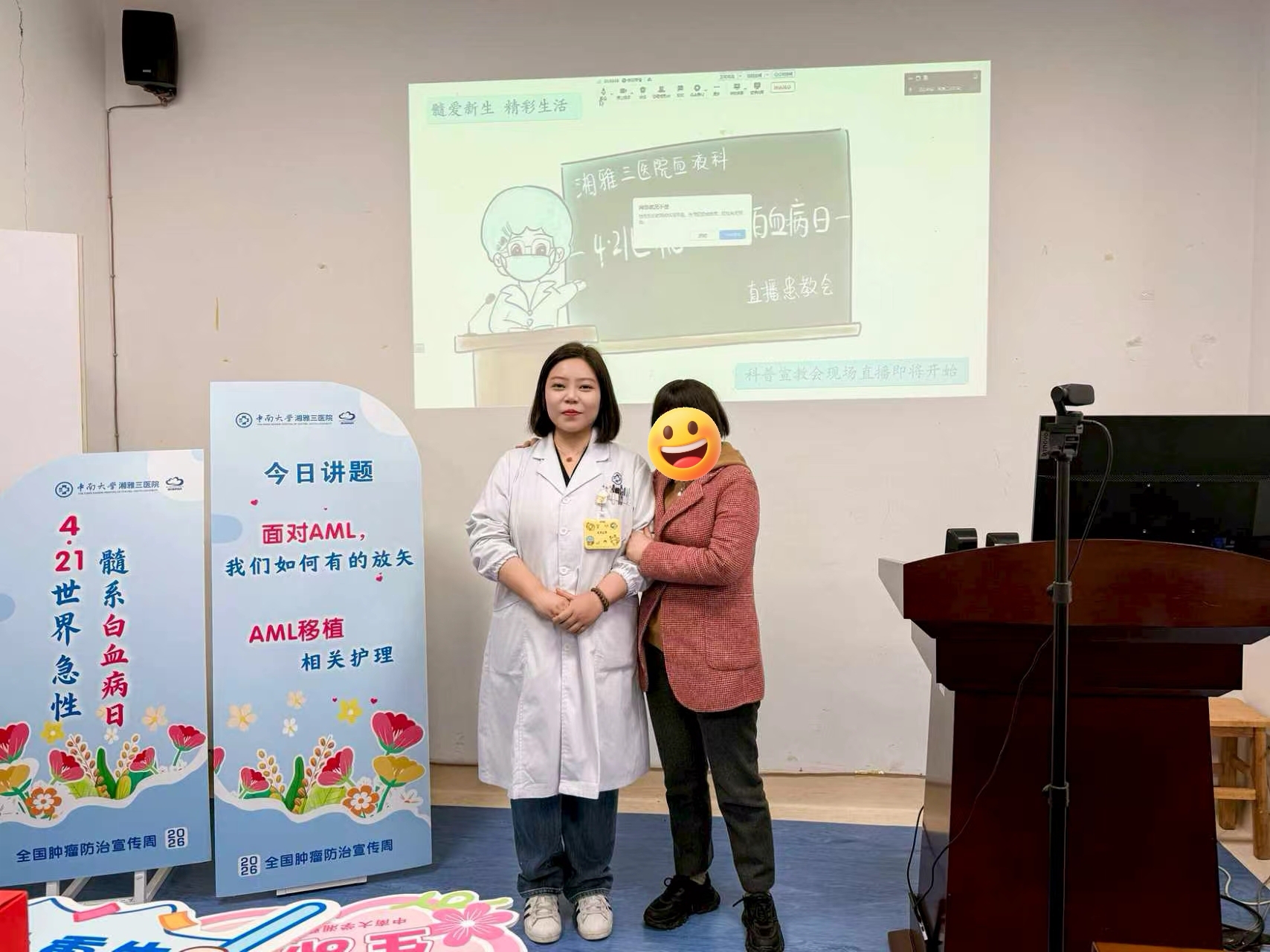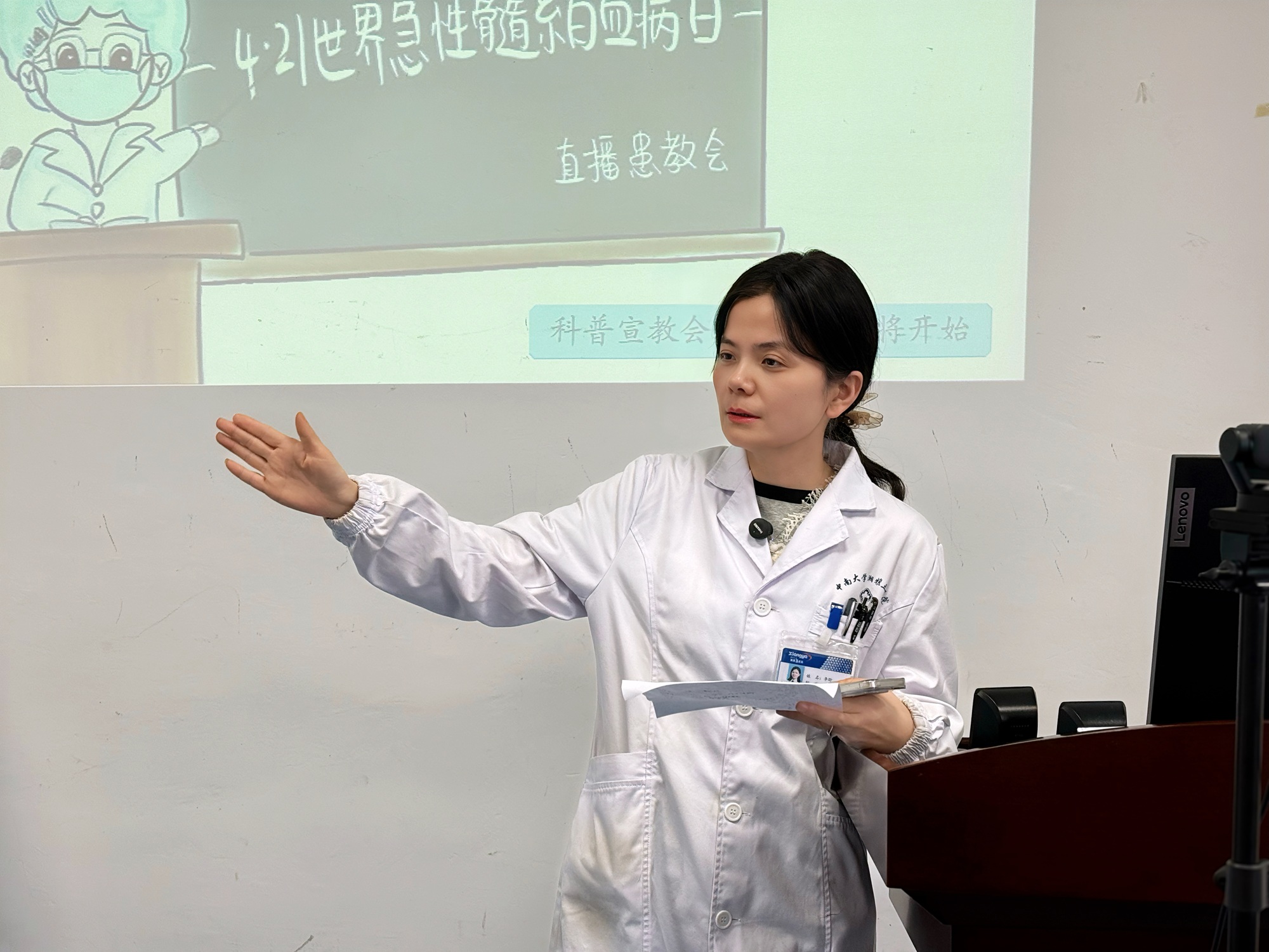 在科普环节,李颖副教授以《面对AML,我们如何有的放矢》为题,系统讲解了急性髓系白血病的精准诊断、危险度分层及个体化治疗策略。她强调,初诊时完善基因检测和免疫分型,是制定精准治疗方案、避免走弯路的关键。阮春红护士长聚焦《AML移植相关护理》,从移植前的身体准备、移植期间的无菌护理到移植后的并发症监测与康复指导,进行了全流程的详细讲解。
