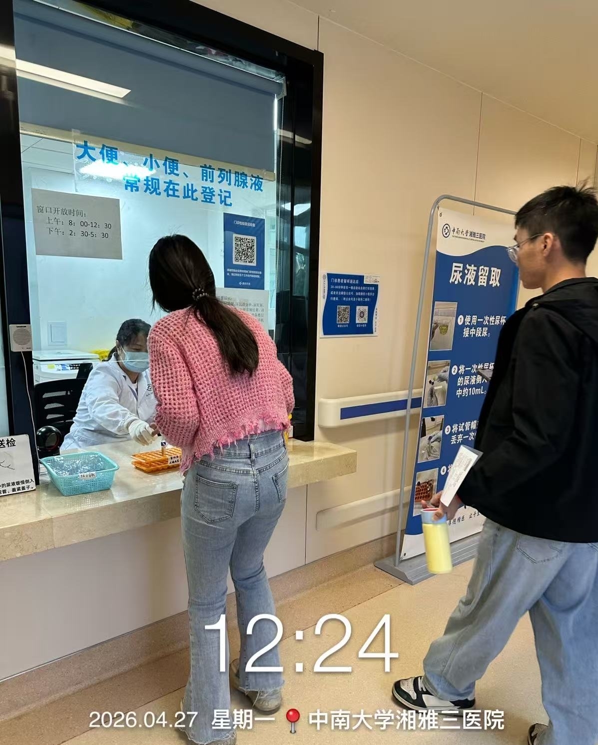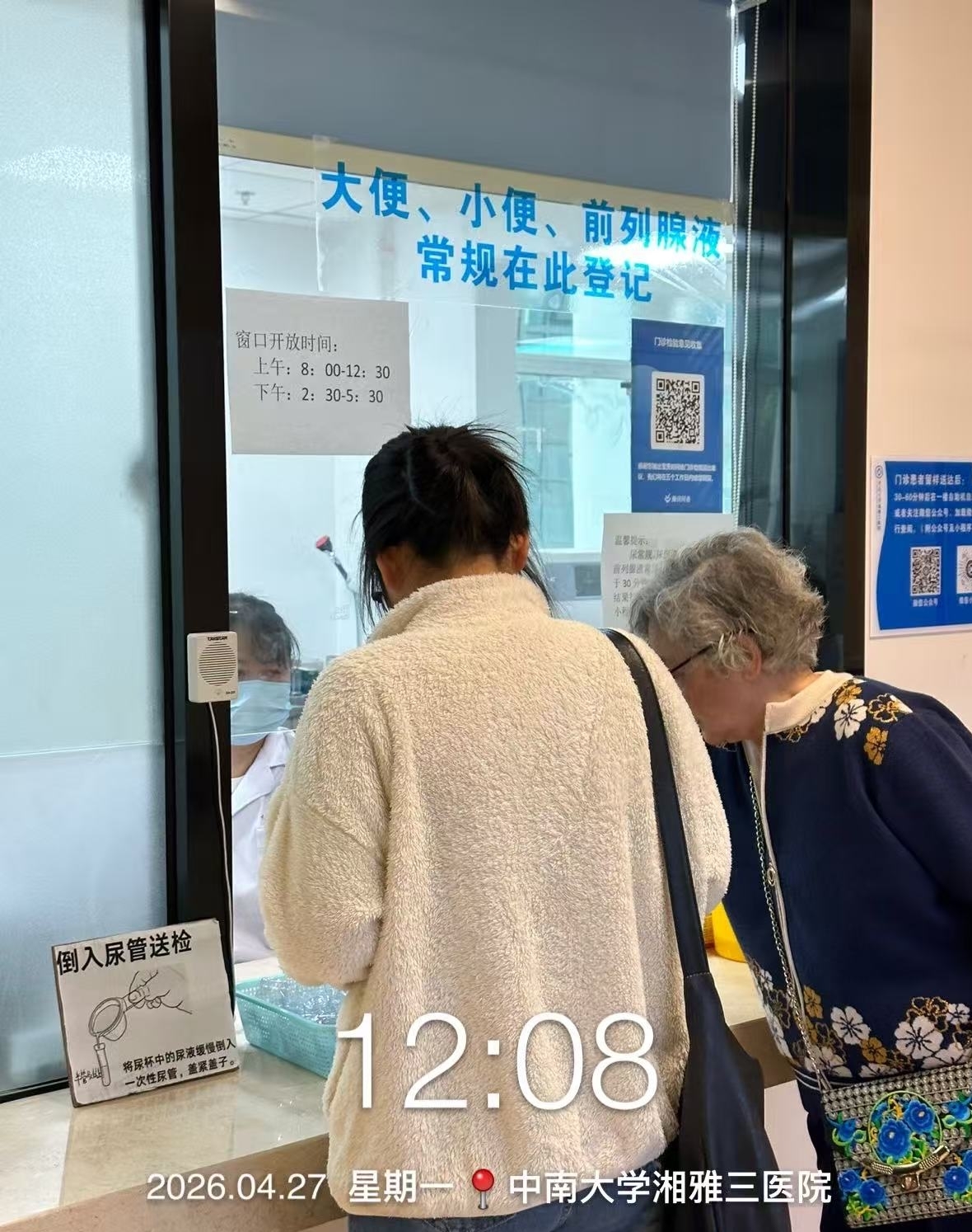 每天上午11:30到12:00这段时间看完病的患者,常常卡在一个尴尬的节点上:医生开了化验单,赶到检验窗口时,卷帘门已经拉下。有些人只需要留个尿液标本,或者问一句24小时尿蛋白怎么留,却只能坐在走廊里,干等到下午2:30。