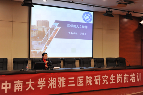 党委书记罗爱静以“医学的人文精神”为题为同学们上了一堂生动的人文素质课。她从医学的人文精神讲到医生的人文精神,进而与同学们分享了医院的人文精神。她说,人文和科学技术是医学的两个必要组成部分,医学科技作为方法和手段为达到医学人文追求的目的而服务,最终的评判标准不是它的技术,而是它的人文目的——人的幸福。她引用了大量生动的事例论述人文精神的重要性。她指出,湘雅三医院院人通过艰苦奋斗,不懈努力,如今,“新湘雅”文化已初具雏形,人文型医院的基础日益坚固并不断发展深化。但构筑系统和完善的人文型医院体系还有待大家的共同努力,她希望更多更优秀的新鲜血液能够加入进来,为湘雅三医院的人文建设注入新的活力。