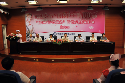 5月8日下午,纪念国际护士节100周年表彰大会在医院外科楼二楼学术报告厅隆重举行。中南大学副书记陶立坚、医政处处长孙维佳,省卫生厅医政处副处长曾清,湖南省护理学会常务副理事长蒋冬梅教授等领导应邀出席,全体在院院领导、“创优”领导小组和支持小组全体成员、各临床医技科室主任、职能科室负责人、党支部书记及全体受表彰的护士共200余人参加大会。会议由副院长朱晒红主持。