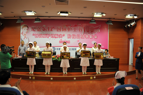 党委书记罗爱静宣读了湘雅三医院关于表彰“优秀护理单元”、第八届“十佳护士”及“优秀护士”、“感恩于心 回报于行”征文获奖者、2011年优秀论奖、“夜班天使”奖等决定,参会领导为获奖集体和个人代表颁奖。