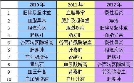 表-2 2010-2012年前十位疾病和阳性发现检出率对比
