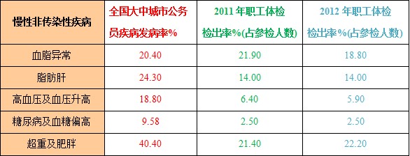 体检中主要的五类“慢病”检出率与全国大中城市公务员健康体检对比情况:见表-1