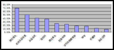 图-1男性参检者前十位疾病和阳性发现