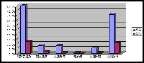 本院职工本次体检后纳入后续管理的“慢病”人群主要有六类,即肥胖及超重、高血压病、血压升高、糖尿病、血糖升高、血脂异常。男性该六类“慢病”检出率普遍高于女性,而其中肥胖及超重、血脂异常的检出率较高。见图-3