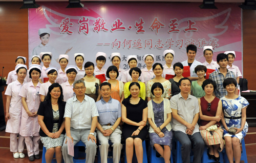 医院党委书记罗爱静发表重要讲话。她说,医院自开展“创建优质护理示范工程”以来,取得了阶段性成果:成为了卫生部“优质护理服务示范工程”重点联系医院、卫生部万名护理人才培训项目医院,三十病区喜获得全国首批“优质护理示范病房”,医院荣获湖南省“优质护理服务”先进单位,成为了湖南省国际造口治疗师学校临床培训基地、湖南省医院协会护理管理专业委员会副主任单位……。她强调,向何遥学习,就要学习她立足平凡、追求崇高的美好情怀;学习她爱岗敬业、忠于职守的职业精神;学习她以德报怨的大爱精神、危机时刻挺身而出的责任意识、甘于奉献的道德情操。她要求把开展向何遥同志学习活动与开展“创先争优”、“三好一满意”等系列活动结合起来,引导和激励广大医务工作者以何遥同志为榜样,立足本职、扎实工作,做爱岗敬业的模范,将学习何遥的力量化为全院的实际行动,在医院改革发展中创造一流业绩,为创建高水平国家优质医院贡献青春和力量。