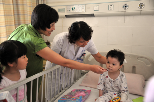 在孩子接受手术的前一天,内科党支部组织各党小组长提着大包小包的零食、牛奶、营养米粉和衣服、玩具来到了钰清的病床前,探望这位可怜的孩子。孩子格外高兴,用她特有的方式感谢着大家对他的关心。