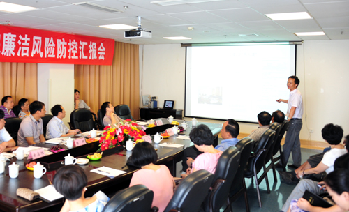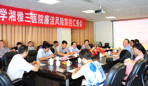 院长陈方平致欢迎辞,代表医院感谢上级领导对湘雅三医院建设和发展的关心与支持,并表示一定努力贯彻落实上级指示。随后,调研组一行听取医院党委副书记兼纪委书记吴希林汇报工作情况。近年来,湘雅三医院完善组织领导,创新宣教形式,健全规章制度,加强民主监督,强化专项治理,深入推进“廉洁三院”建设。就廉洁风险防控试点工作,医院从“精心部署,广泛发动;以点带面,重点试点;认真调研,理清职权;开发软件,完善防控”四个方面,建设廉洁和谐医院“小社会”。检查组对医院定期举办廉政文化节,开办廉政文化讲堂、廉政手机报,拓展廉政教育基地等活动饶有兴致并具体询问了开展情况。