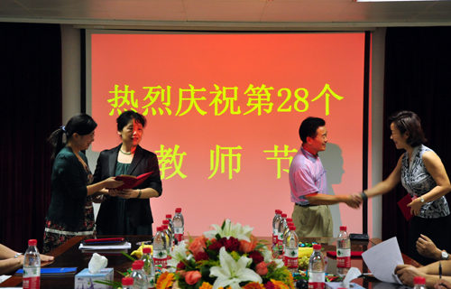黄飞舟副院长首先向在座教师表达了教师节祝贺,并简单介绍了一年来医院在教学方面取得的主要成绩。他说,一年来医院在教学方面取得了很多成绩,特别是有我院学子参与的团队荣获第三届全国高等医学院校大学生临床技能竞赛特等奖,除此以外还可以用“三个一”来概括:一是全校本科教学评估中,我们又获得了第一名;二是新编一本国家级本科规范教材《临床技能实验学》;三是新增教学名师一名。这些成绩的取得是我们老教授、中青年教师无私奉献的结果,是教务部不懈努力的结果。